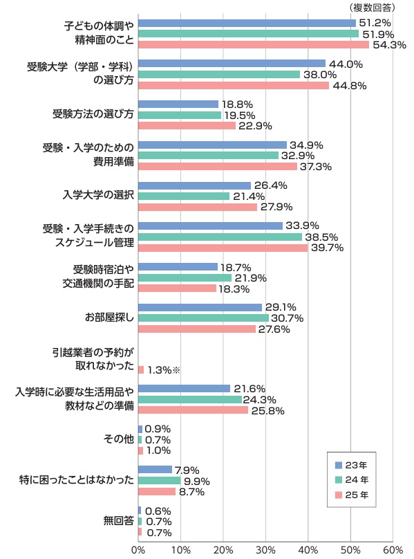 子どもの受験から入学までで困った・悩んだこととして「子どもの体調や精神面」が最も多く、その割合も年々増えてきています。