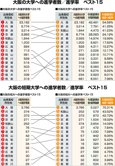 | 大阪への進学者数と「大学・短大進学者のうち何%が大阪に進学したか」という進学率の2つの視点から都道府県別にまとめました。 |