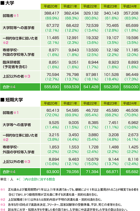 大学・短期大学の卒業生(男子+女子)の進路について、過去5年間の推移をまとめました。