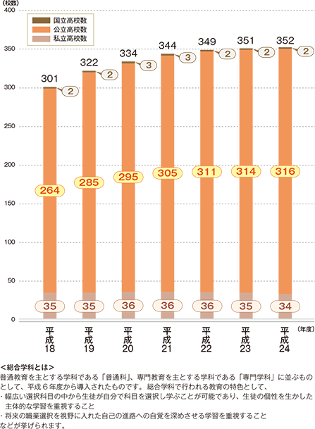 文部科学省では、全国で約500校の公立高校に総合学科を設置する(=通学範囲 に少なくとも1校整備)ことを目標としております。