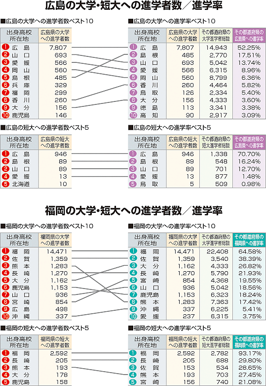 | 広島、福岡への進学者数と「大学・短大進学者のうち何%が広島、福岡に進学したか」という進学率の2つの視点から都道府県別にまとめました。 |