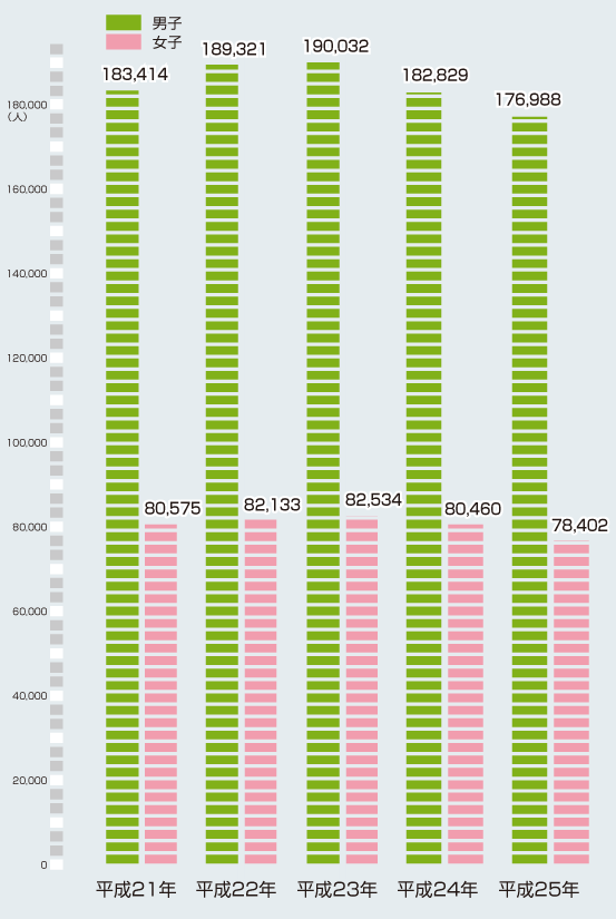 | データ資料: | 各年の学校基本調査報告書 平成25年は学校基本調査速報(平成25年8月発行)より<文部科学省> |