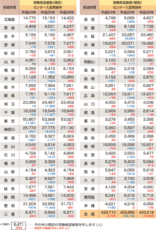 | データ資料: | 「平成26年度大学入試センター試験の志願者数(確定)について」より <独立行政法人大学入試センター> |