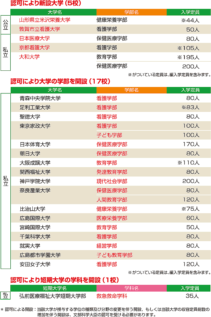 | データ資料: | 平成26年度開設予定大学一覧、 平成26年度開設予定学部等認可申請一覧 |