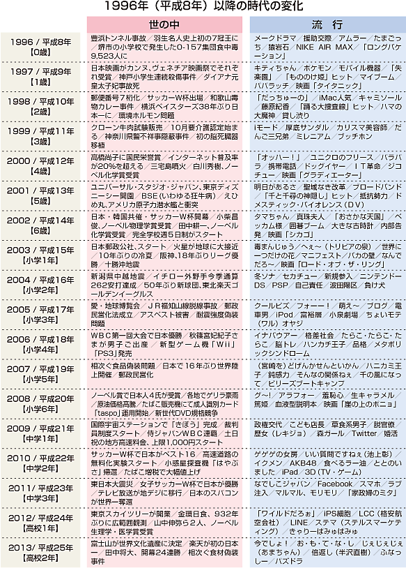 現在の高校3年生が生まれた年から、昨年までの「世の中」と「流行」をまとめました。彼らの人間像を理解するための一助としてご高覧いただければ幸いです。 |