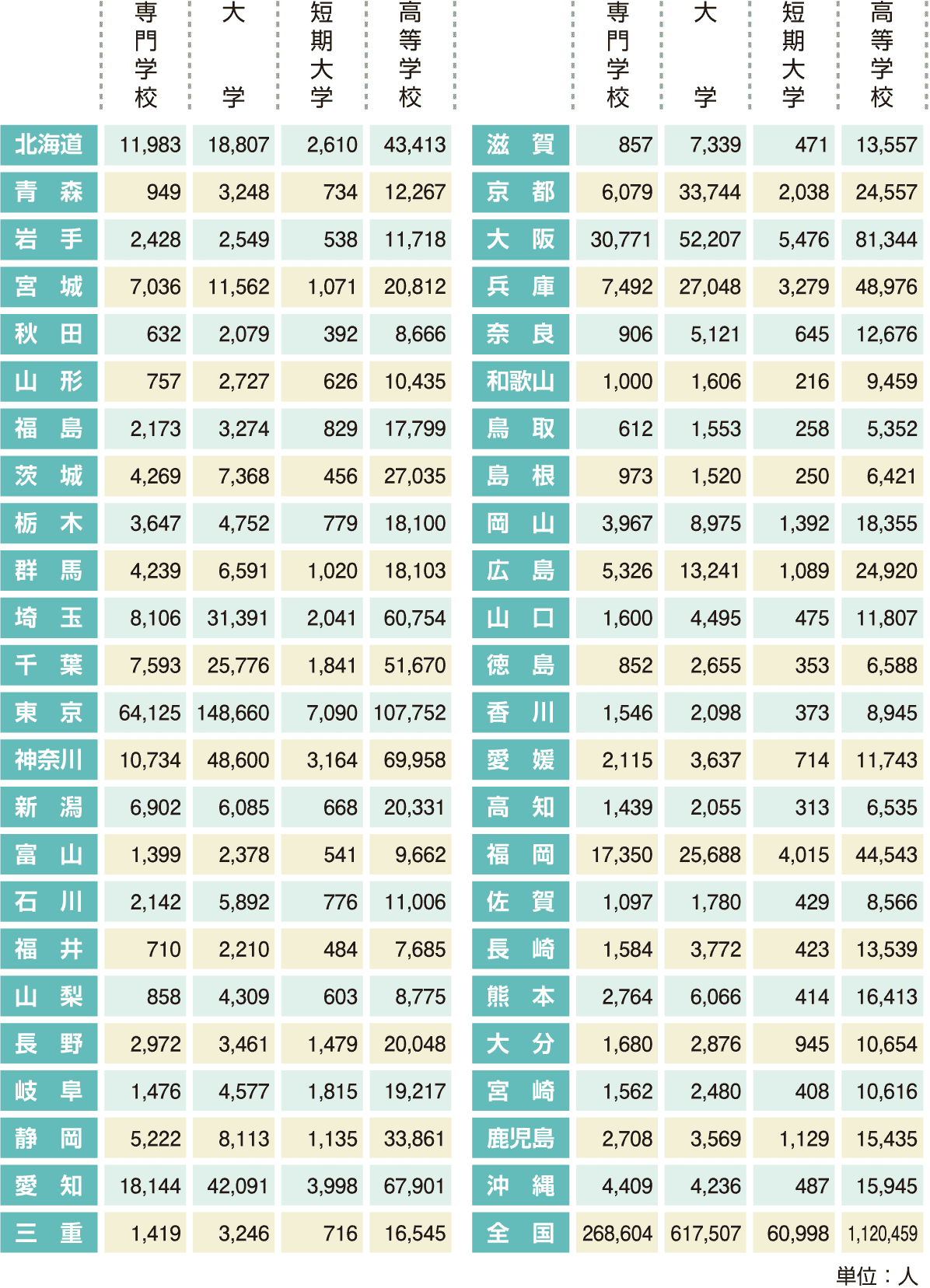 都道府県別/専門学校・大学・短期大学・高等学校