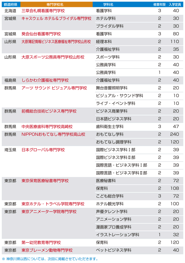 各都道府県にて認可を受け、2017年4月に開校された私立の専修学校の専門課程を記載しています。
