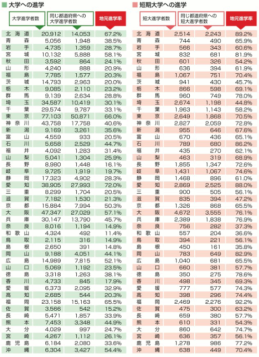 地元進学率;同じ都道府県の大学・短大へ進学した割合