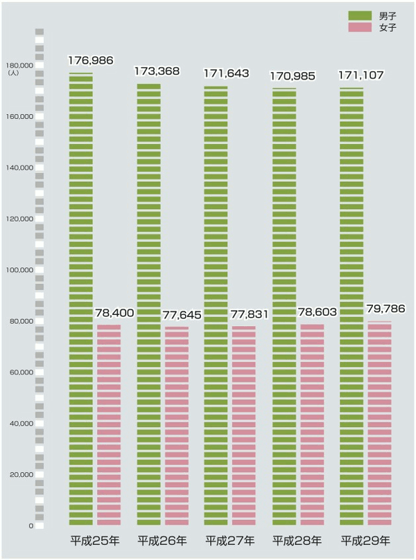 | データ資料: | 各年の学校基本調査(文部科学省ホームページ)よりグラフに して作成 平成29年は学校基本調査速報(平成29年8月発表)より |