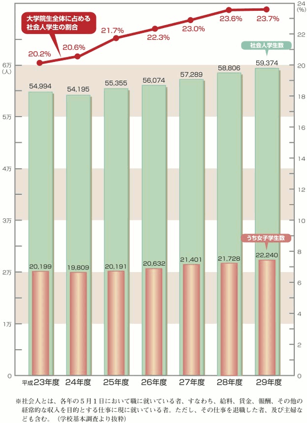 | 大学院生全体に占める社会人学生の割合と学生数 |