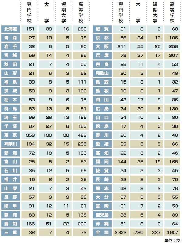 | 都道府県別/専門学校・大学・短期大学・高等学校 |