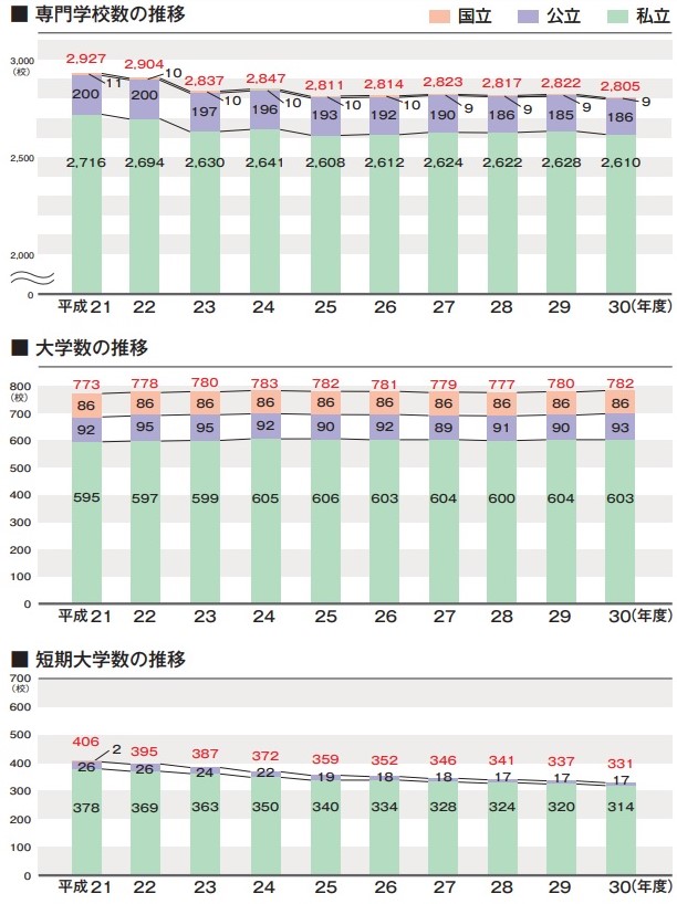 専門学校・大学・短期大学数の推移