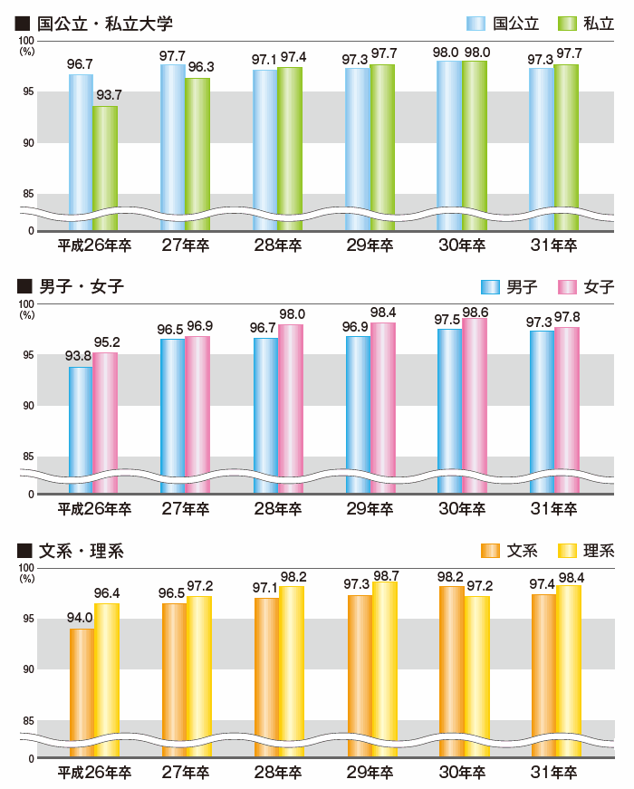 | 6年間の就職率* の推移(平成26年3月卒~31年3月卒) | *就職率は、就職希望者のうち、就職した人の割合です。 |