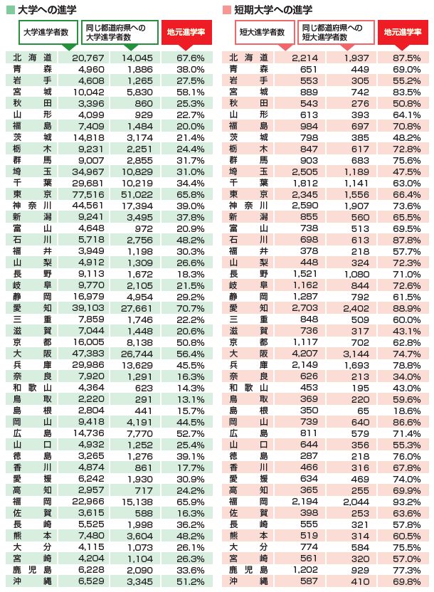 | 2019年に大学・短期大学へ進学した者(浪人含む)のうち、出身高校と同じ都道府県の 大学・短期大学へ進学した割合です。 |