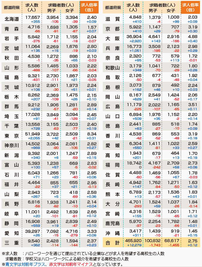 | データ資料: | 令和元年度「高校・中学新卒者のハローワーク求人に係わる 求人・求職・就職内定状況」取りまとめ(令和元年9月末現在) 厚生労働省のホームページより表にして作成 |