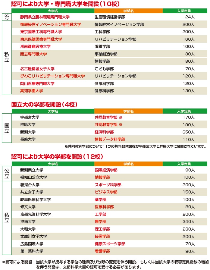 | データ資料: | 令和2年度開設予定の大学等の設置等に係る答申について 令和2年度国立大学の入学定員(予定)について 令和2年度開設予定の学部等の設置等に係る答申について (文部科学省ホームページ)より表にして作成 |