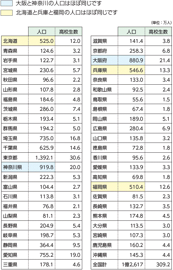 | 出典元: | 都道府県別人口は総務省 「人口推計(2019年10月1日現在)」より 高校生数は文部科学省「学校基本調査(2020年5月1日現在)」より 全日制+定時制の全学年合計の人数となります。 |