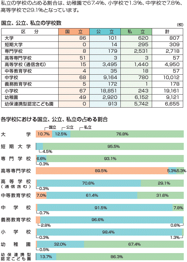 国立、公立、私立の学校数と割合