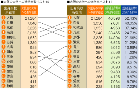 | 大阪への進学者数と「大学・短大進学者のうち何%が大阪に進学したか」という進学率の2つの視点から都道府県別にまとめました。 |