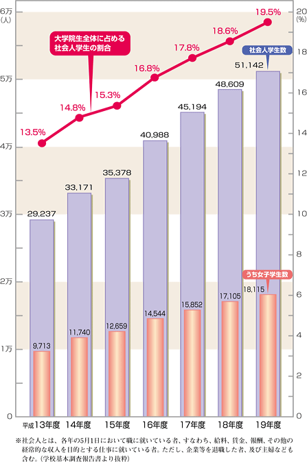 | 平成12年の「社会人学生数」調査開始以降増加し続け、平成19年度には社会人学 生数51,142人、大学院学生数に占める割合も19.5%となっております。 |