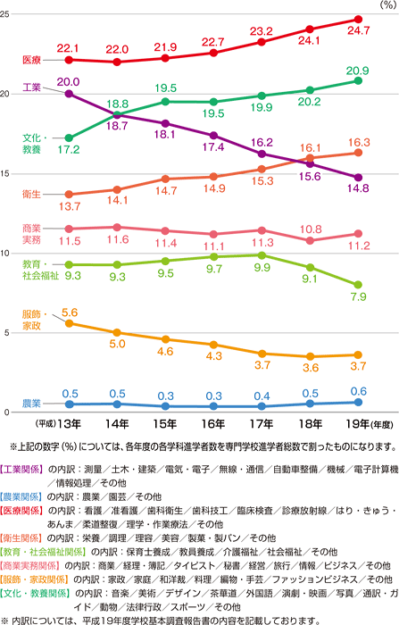 | 平成13年度~19年度(4月入学者の学科別割合) |