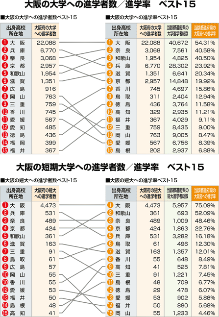| 大阪への進学者数と「大学・短大進学者のうち何%が大阪に進学したか」という進学率の 2つの視点から都道府県別にまとめました。 |