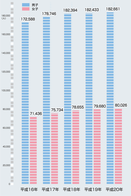 | 調査時期:各年5月1日現在 データ資料:各年の学校基本調査報告書<文部科学省> ※平成20年は、平成20年度学校基本調査速報(平成20年8月発行)より |