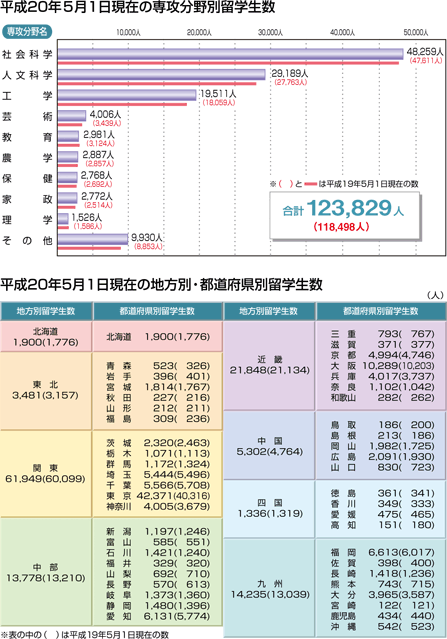 | 調査対象:留学ビザにより日本の高等教育機関へ入学、または入学するための準備教育を 受ける外国人学生 調査時期:各年5月1日現在 発表時期:平成20年12月 データ資料:「平成20年度外国人留学生在籍状況調査結果」独立行政法人日本学生支援機構 |