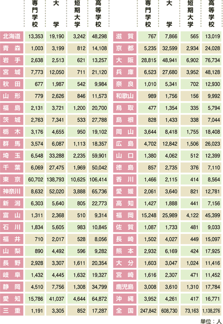 都道府県別/専門学校・大学・短期大学・高等学校