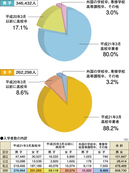 平成21年4月大学入学者のうち、同年3月に高校を卒業した学生(現役入学者)の占める割合は、男子80.0%、女子88.2%です。