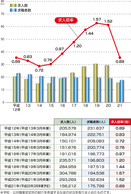 | データ資料: | 平成21年度高校・中学新卒者の就職内定状況等(平成21年9月末現在)について<厚生労働省> |