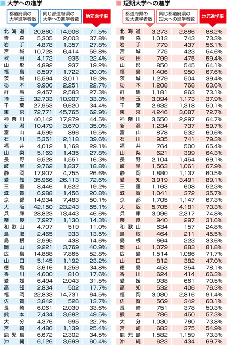 地元進学率;同じ都道府県の大学・短大へ進学した割合