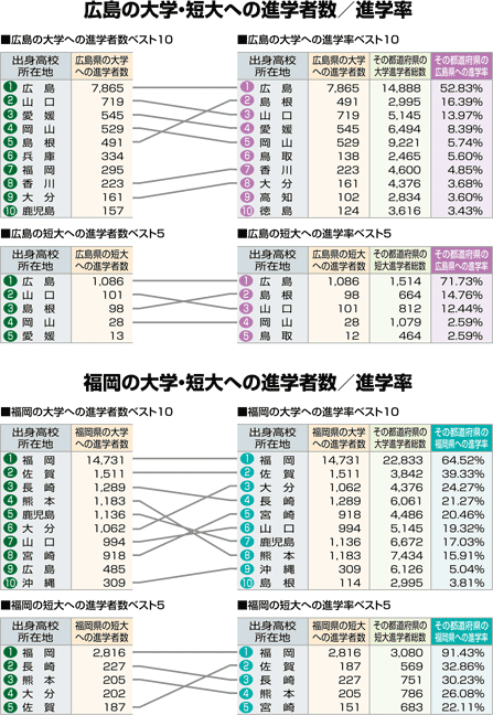 広島、福岡への進学者数と「大学・短大進学者のうち何%が広島、福岡に進学したか」という進学率の2つの視点から都道府県別にまとめました。