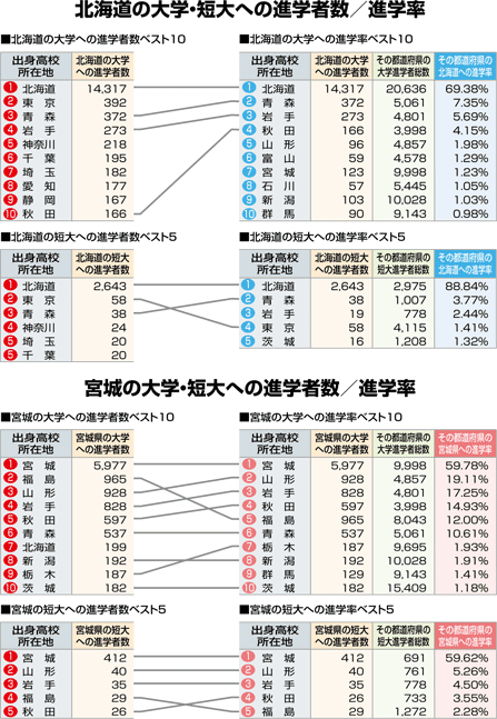 | 北海道、宮城への進学者数と「大学・短大進学者のうち何%が北海道、宮城に進学したか」という進学率の2つの視点から都道府県別にまとめました。 |