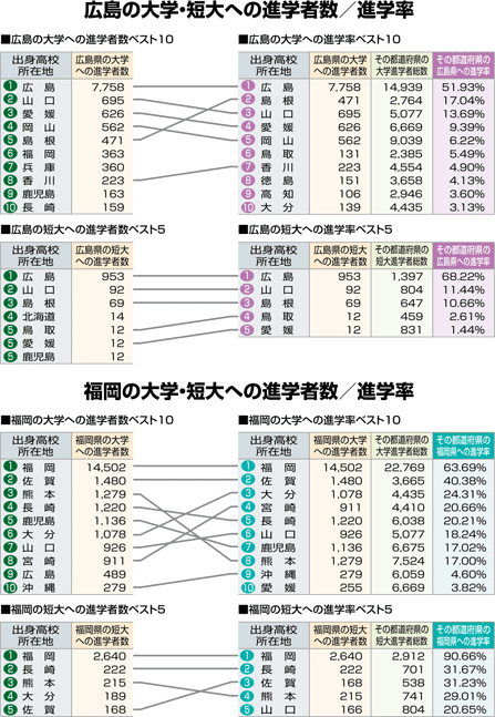 広島、福岡への進学者数と「大学・短大進学者のうち何%が広島、福岡に進学したか」という進学率の2つの視点から都道府県別にまとめました。