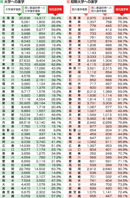 地元進学率;同じ都道府県の大学・短大へ進学した割合