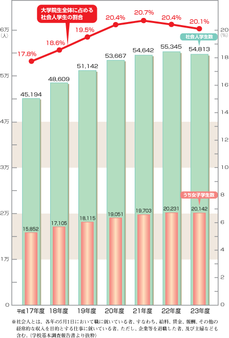 社会人学生数54,813人、大学院学生数に占める割合は20.1%と若干減少しました。