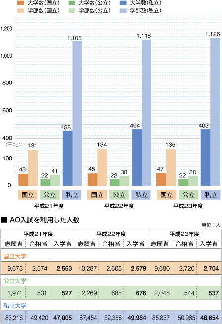 AO入試を実施した国公私立の大学・学部数(平成21~23年度)
