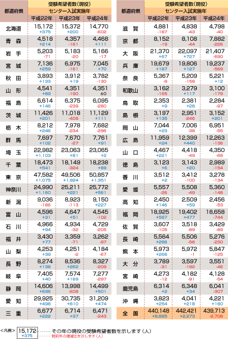 | データ資料: | 平成24年度センター試験志願者数(確定)について <独立行政法人大学入試センター> |