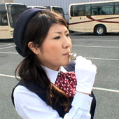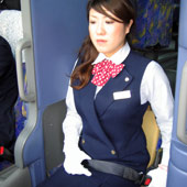 バスに乗って観光の案内をして、お客さまを楽しませます。バスが後ろに動いたり曲がる時には、安全を確かめて運転手を助けます。