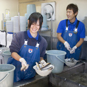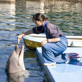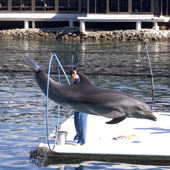 水族館などのショーで活躍するイルカの世話をし、芸を教える仕事です。ショーではイルカと一緒にお客さまを楽しませます。