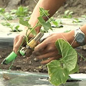 田や畑で、米や野菜、果物などを育てる仕事です。でき上がった農作物を販売して収入を得ています。家族で働く人もいます。
