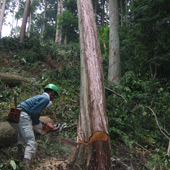 木材にするための木を山に植え、育てる仕事です。また、木を切って一定の長さにそろえたり、木を集めて運ぶ作業もあります。