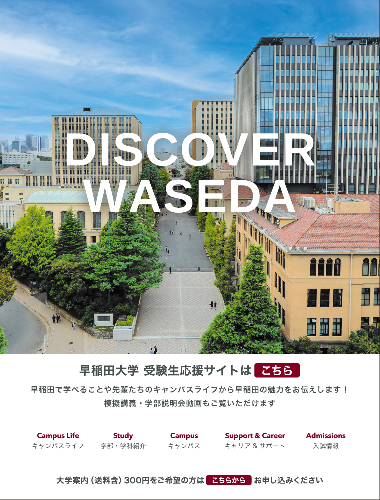 受験生応援サイト「DISCOVER WASEDA」では、動画を中心とした多彩なコンテンツで早稲田の学びやキャンパスライフの魅力を伝えています。ぜひご覧ください。