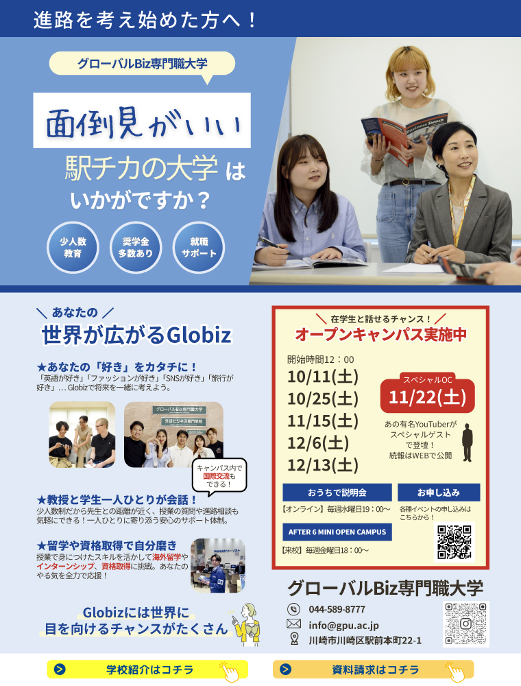 オープンキャンパス イベント一覧 すべて 来校型 オンライン型 11/15(土) 12:00~14:00 学校説明会 神奈川県川崎市川崎区駅前本町22-1 友達・保護者OK 11/19(水) 19:00~20:00 おうちで説明会(ONLINE BRIEFING) 参加する 11/21(金) 18:00~19:00 アフター6ミニオープンキャンパス 神奈川県川崎市川崎区駅前本町22-1 友達・保護者OK 奨学金制度の紹介 参加する 11/22(土) 12:00~13:00 特別オープンキャンパス(高校生限定) 神奈川県川崎市川崎区駅前本町22-1 友達・保護者OK 参加する 11/26(水) 19:00~20:00 おうちで説明会(ONLINE BRIEFING) 参加する 11/28(金) 18:00~19:00 アフター6ミニオープンキャンパス 神奈川県川崎市川崎区駅前本町22-1 友達・保護者OK 奨学金制度の紹介 参加する 12/3(水) 19:00~20:00 おうちで説明会(ONLINE BRIEFING) 参加する 12/5(金) 18:00~19:00 アフター6ミニオープンキャンパス 神奈川県川崎市川崎区駅前本町22-1 友達・保護者OK 奨学金制度の紹介 参加する 12/6(土) 12:00~14:00 学校説明会 神奈川県川崎市川崎区駅前本町22-1 友達・保護者OK 参加する 12/10(水) 19:00~20:00 おうちで説明会(ONLINE BRIEFING) 参加する 12/12(金) 18:00~19:00 アフター6ミニオープンキャンパス 神奈川県川崎市川崎区駅前本町22-1 友達・保護者OK 奨学金制度の紹介 参加する 12/13(土) 12:00~14:00 学校説明会 神奈川県川崎市川崎区駅前本町22-1 友達・保護者OK 参加する 12/17(水) 19:00~20:00 おうちで説明会(ONLINE BRIEFING) 参加する 12/19(金) 18:00~19:00 アフター6ミニオープンキャンパス 神奈川県川崎市川崎区駅前本町22-1 友達・保護者OK 奨学金制度の紹介 参加する 1/7(水) 19:00~20:00 おうちで説明会(ONLINE BRIEFING) 参加する 1/9(金) 18:00~19:00 アフター6ミニオープンキャンパス 神奈川県川崎市川崎区駅前本町22-1 友達・保護者OK 奨学金制度の紹介 参加する 1/14(水) 19:00~20:00 おうちで説明会(ONLINE BRIEFING) 参加する 1/16(金) 18:00~19:00 アフター6ミニオープンキャンパス 神奈川県川崎市川崎区駅前本町22-1 友達・保護者OK 奨学金制度の紹介 参加する 1/21(水) 19:00~20:00 おうちで説明会(ONLINE BRIEFING) 参加する 1/23(金) 18:00~19:00 アフター6ミニオープンキャンパス 神奈川県川崎市川崎区駅前本町22-1 友達・保護者OK 奨学金制度の紹介 参加する 1/24(土) 12:00~14:00 学校説明会 神奈川県川崎市川崎区駅前本町22-1 友達・保護者OK 参加する 1/28(水) 19:00~20:00 おうちで説明会(ONLINE BRIEFING) 参加する 1/30(金) 18:00~19:00 アフター6ミニオープンキャンパス 神奈川県川崎市川崎区駅前本町22-1 友達・保護者OK 奨学金制度の紹介 参加する 2/4(水) 19:00~20:00 おうちで説明会(ONLINE BRIEFING) 参加する 2/6(金) 18:00~19:00 アフター6ミニオープンキャンパス 神奈川県川崎市川崎区駅前本町22-1 友達・保護者OK 奨学金制度の紹介 参加する 2/7(土) 12:00~14:00 学校説明会 神奈川県川崎市川崎区駅前本町22-1 友達・保護者OK 参加する 2/18(水) 19:00~20:00 おうちで説明会(ONLINE BRIEFING) 参加する 2/20(金) 18:00~19:00 アフター6ミニオープンキャンパス 神奈川県川崎市川崎区駅前本町22-1 友達・保護者OK 奨学金制度の紹介 参加する 2/25(水) 19:00~20:00 おうちで説明会(ONLINE BRIEFING) 参加する 2/27(金) 18:00~19:00 アフター6ミニオープンキャンパス 神奈川県川崎市川崎区駅前本町22-1 友達・保護者OK 奨学金制度の紹介 参加する 3/4(水) 19:00~20:00 おうちで説明会(ONLINE BRIEFING) 参加する 3/6(金) 18:00~19:00 アフター6ミニオープンキャンパス 神奈川県川崎市川崎区駅前本町22-1 友達・保護者OK 奨学金制度の紹介 参加する 3/7(土) 12:00~14:00 学校説明会 神奈川県川崎市川崎区駅前本町22-1 友達・保護者OK 参加する 3/11(水) 19:00~20:00 おうちで説明会(ONLINE BRIEFING) 参加する 3/18(水) 19:00~20:00 おうちで説明会(ONLINE BRIEFING) 参加する 3/31(火) 12:00~14:00 学校説明会 神奈川県川崎市川崎区駅前本町22-1 友達・保護者OK 参加する もっと見る 11/15(土) 12:00~14:00 学校説明会 神奈川県川崎市川崎区駅前本町22-1 友達・保護者OK 11/21(金) 18:00~19:00 アフター6ミニオープンキャンパス 神奈川県川崎市川崎区駅前本町22-1 友達・保護者OK 奨学金制度の紹介 参加する 11/22(土) 12:00~13:00 特別オープンキャンパス(高校生限定) 神奈川県川崎市川崎区駅前本町22-1 友達・保護者OK 参加する 11/28(金) 18:00~19:00 アフター6ミニオープンキャンパス 神奈川県川崎市川崎区駅前本町22-1 友達・保護者OK 奨学金制度の紹介 参加する 12/5(金) 18:00~19:00 アフター6ミニオープンキャンパス 神奈川県川崎市川崎区駅前本町22-1 友達・保護者OK 奨学金制度の紹介 参加する 12/6(土) 12:00~14:00 学校説明会 神奈川県川崎市川崎区駅前本町22-1 友達・保護者OK 参加する 12/12(金) 18:00~19:00 アフター6ミニオープンキャンパス 神奈川県川崎市川崎区駅前本町22-1 友達・保護者OK 奨学金制度の紹介 参加する 12/13(土) 12:00~14:00 学校説明会 神奈川県川崎市川崎区駅前本町22-1 友達・保護者OK 参加する 12/19(金) 18:00~19:00 アフター6ミニオープンキャンパス 神奈川県川崎市川崎区駅前本町22-1 友達・保護者OK 奨学金制度の紹介 参加する 1/9(金) 18:00~19:00 アフター6ミニオープンキャンパス 神奈川県川崎市川崎区駅前本町22-1 友達・保護者OK 奨学金制度の