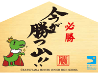 「勝山」という縁起の良い名前を使って「今が勝つ山!!」と大書された絵馬ステッカーには、恐竜のイラストが描かれている。「合格祈願」「必勝」「交通安全」の3種あり、それぞれ「恐竜渓谷ふくい勝山ジオパーク」のロゴマーク入りバージョンも作成した。