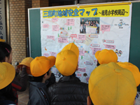11月27日、4年生と警察官が三和支所を訪問。子どもたちから手作りの安全マップを受け取った支所長は、子どもたちに感謝し、「地域の多くの人々にこの地図を見ていただき、危ない場所ではこれまで以上に気をつけ、安全な場所はさらに安全になるようにしていきたい」と気を引き締めていた。